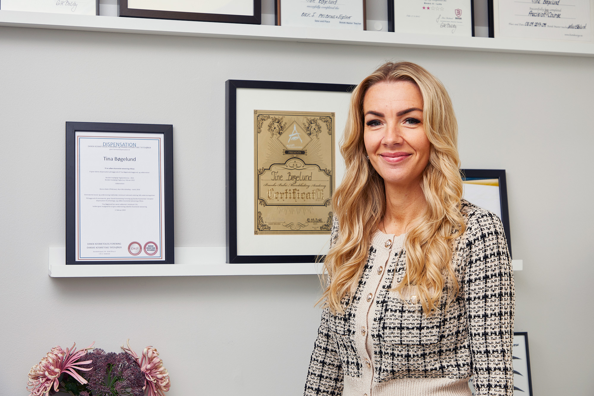 Uddannet negleteknikker indenfor CND med speciale i både akryl, gele og shellac. Derudover er jeg uddannet bryn- og vippe stylist med master class hos Elleebana.